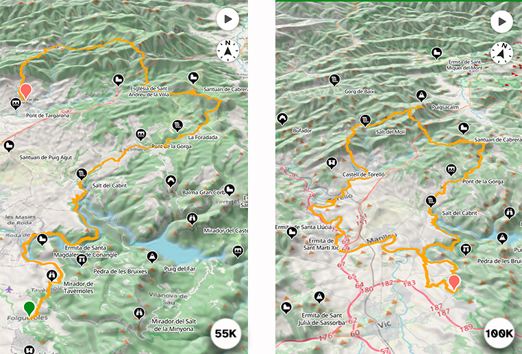 La 100 km és un recorregut circular amb sortida i arribada a Folgueroles, un gran repte per viure la Increïble en tota la seva essència. La 55 km també surt de Folgueroles però acaba a Sant Pere de Torelló, en un traçat intens i espectacular.